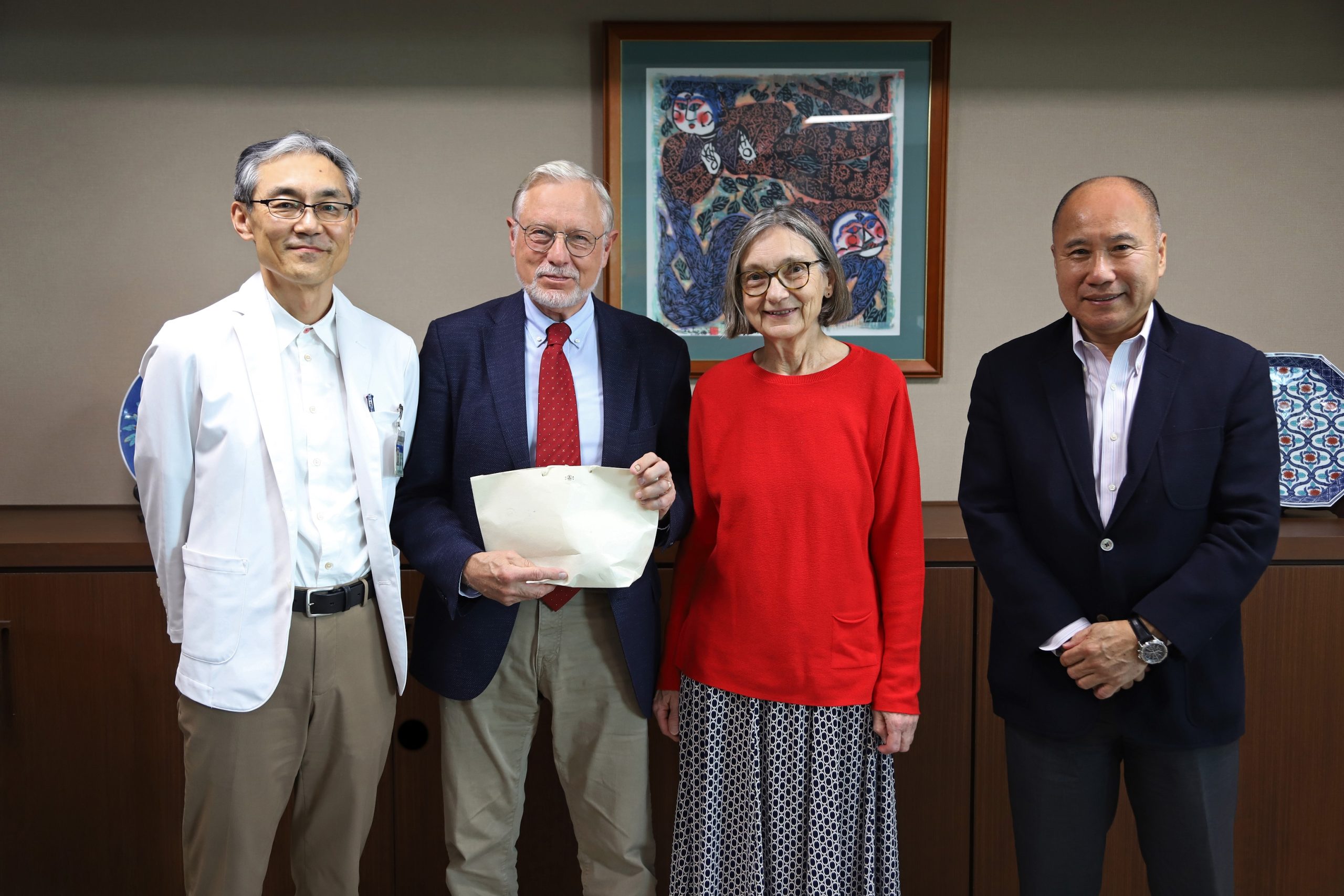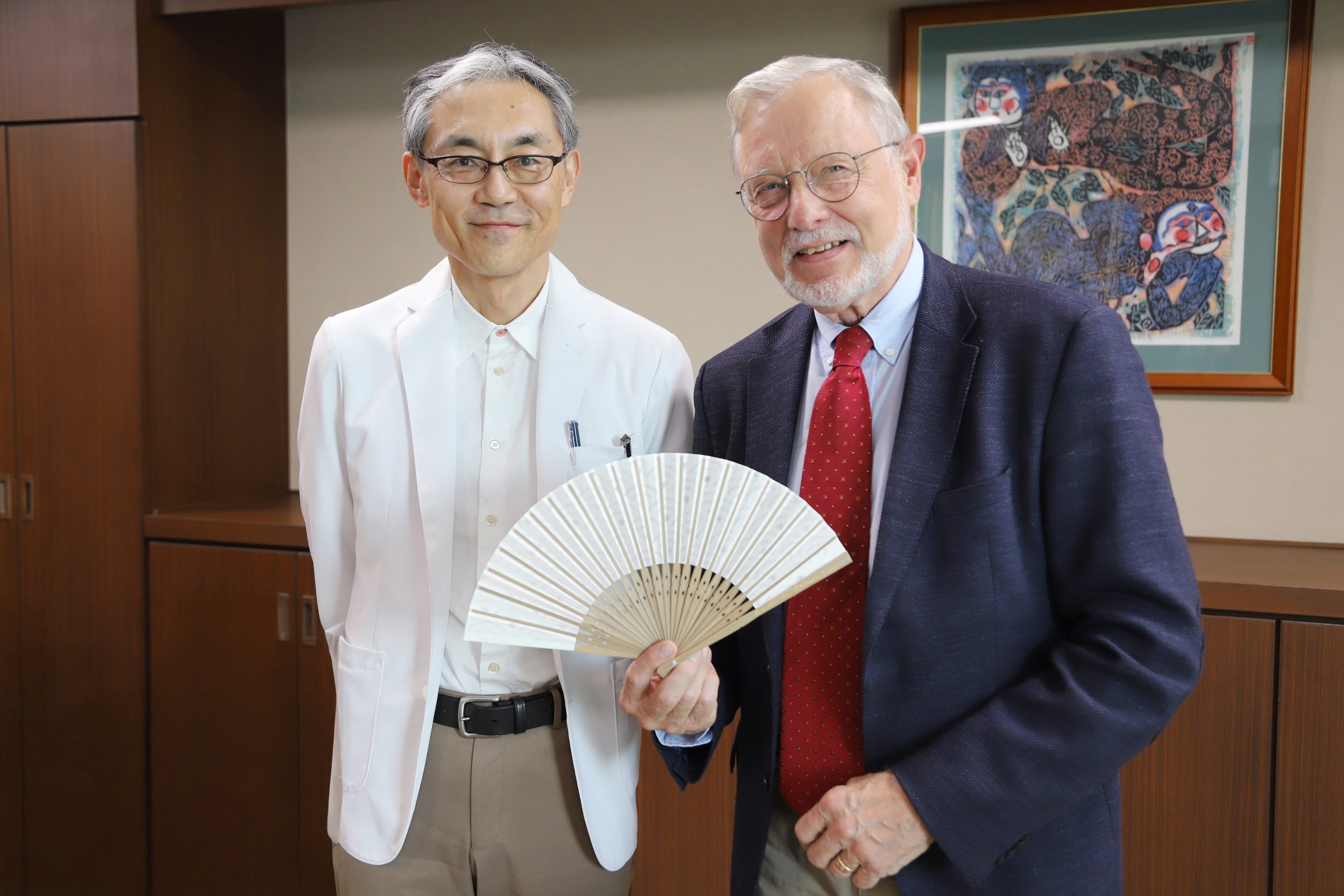 医学部長室を訪問され、副島医学部長より佐賀県の伝統工芸品である名尾手すき和紙の扇子が贈呈されました。その後、Dahlén教授は本学において最新の研究成果に関する講演を行っていただきました。