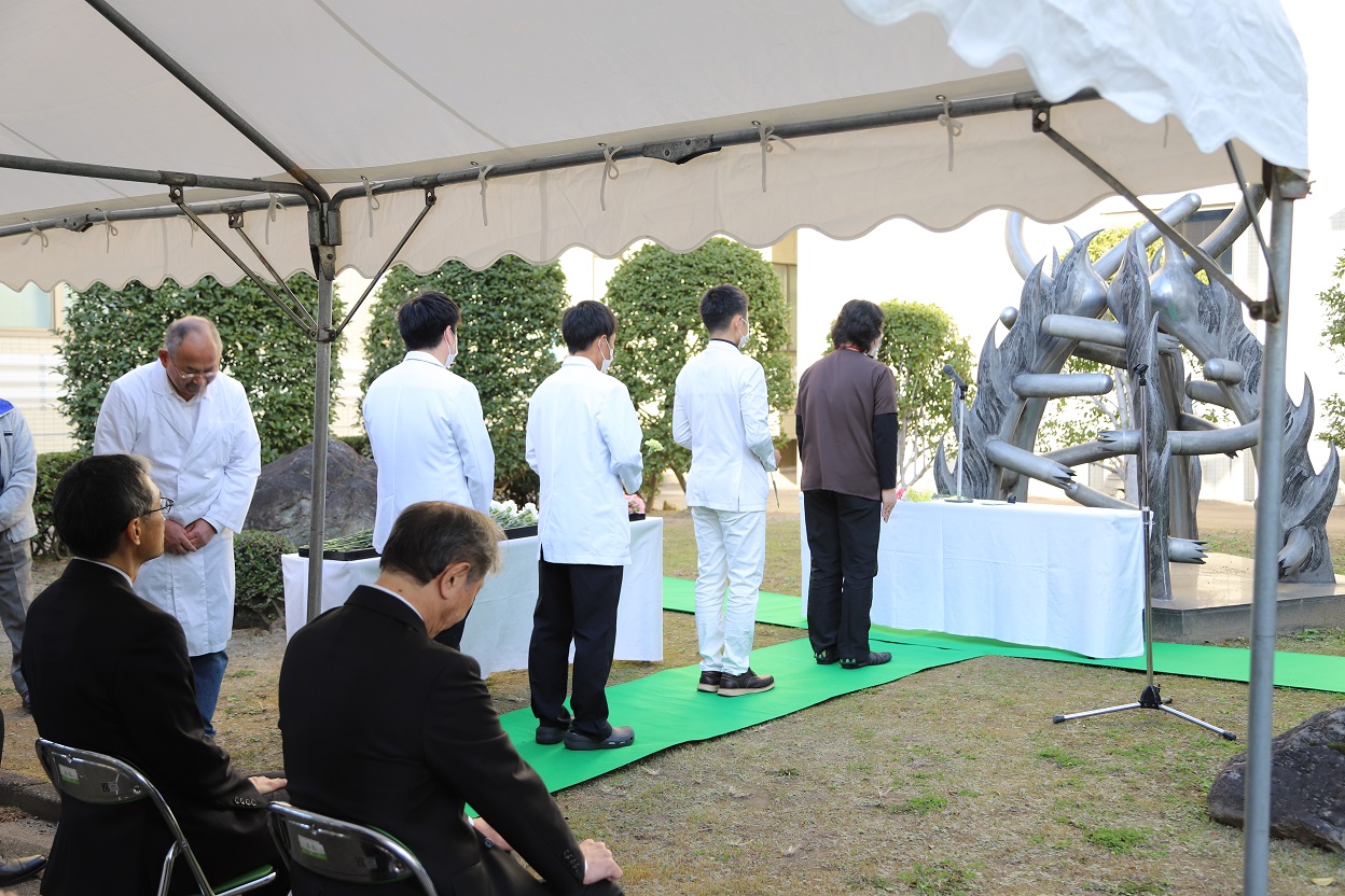 動物慰霊祭には、青木理事(研究・社会連携担当)、光武総合分析実験センター長の他、医学部からは副島医学部長、野口医学部附属病院長を始め、多数の職員・学生が参列しました。