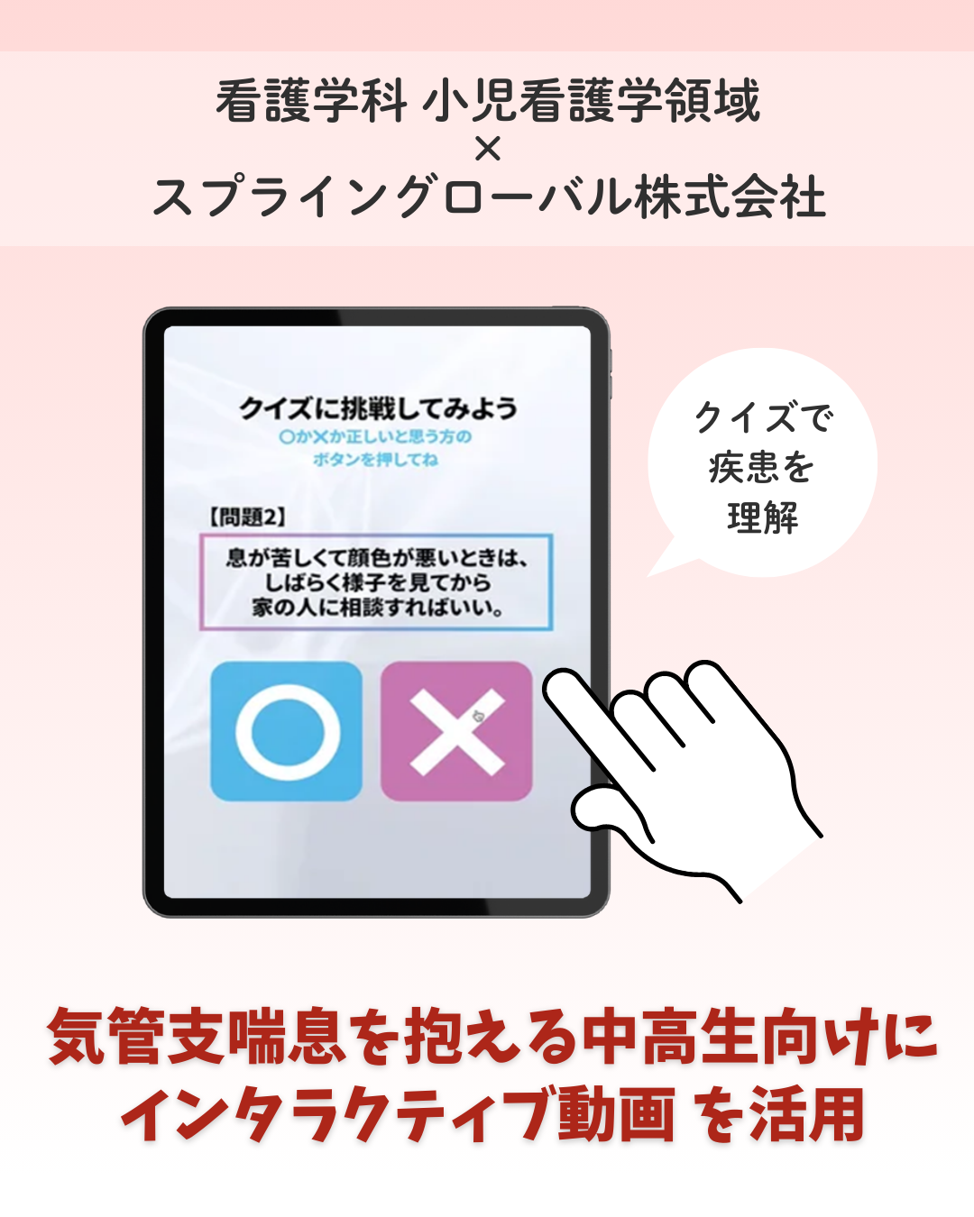 看護学科 小児看護学領域では、スプライングローバル株式会社・附属病院呼吸器内科・嬉野医療センター小児科とともに気管支喘息を抱える中高生を対象とした教育研究プロジェクトを実施しています!