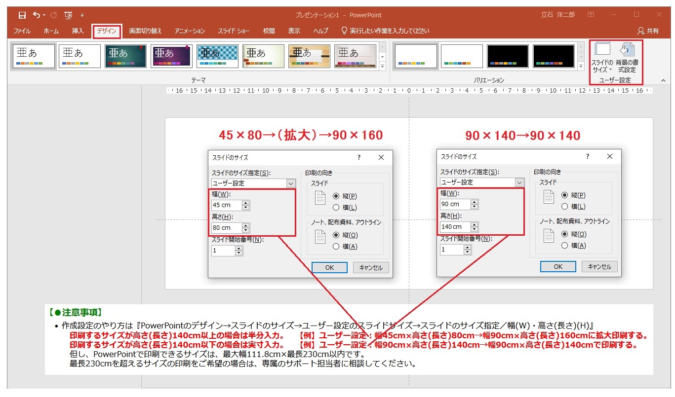 - ご希望の最長印刷サイズが、140cmを超える場合は、PowerPointのページ設定を幅・高さとも半分のサイズで作成してください。